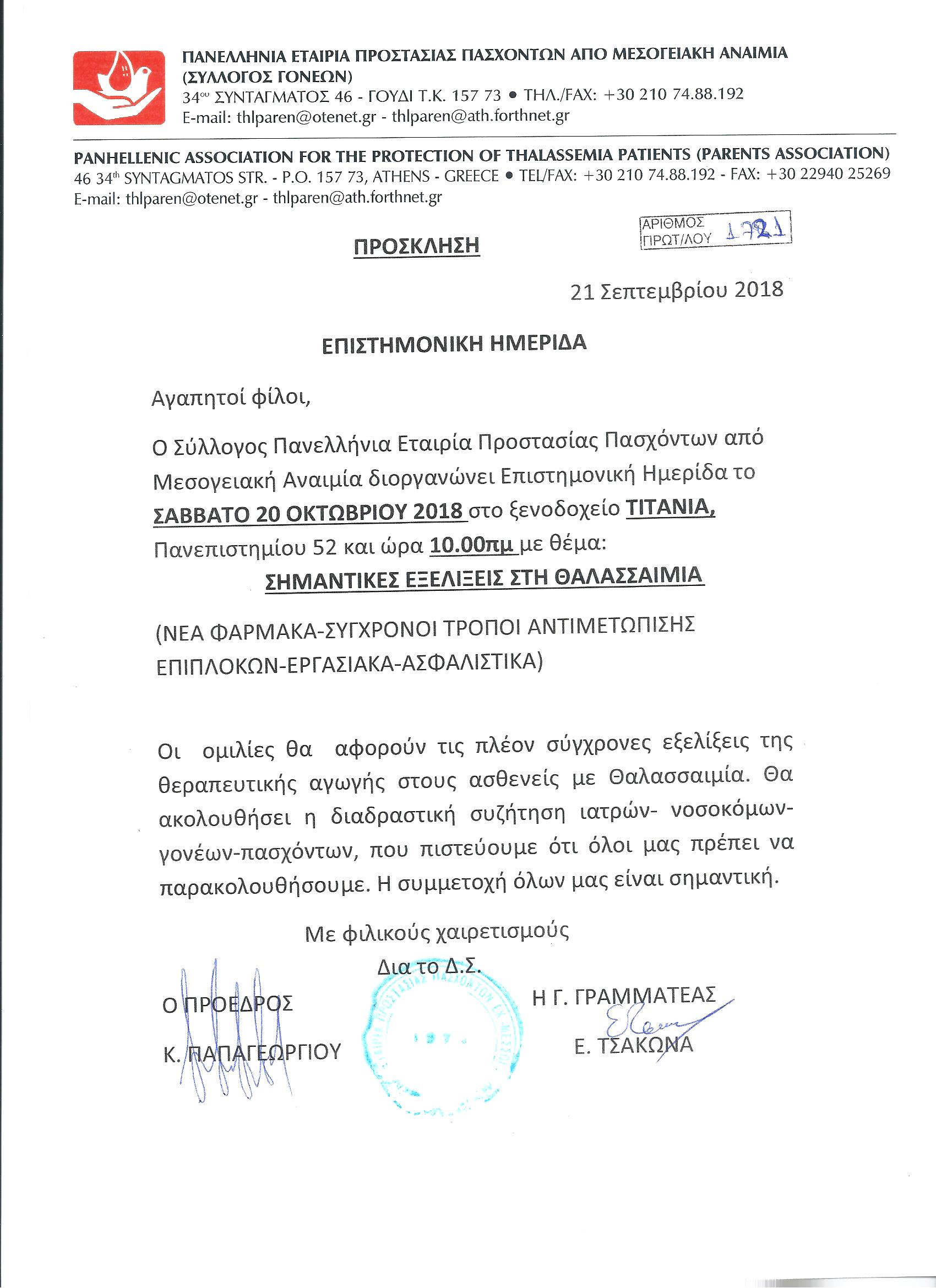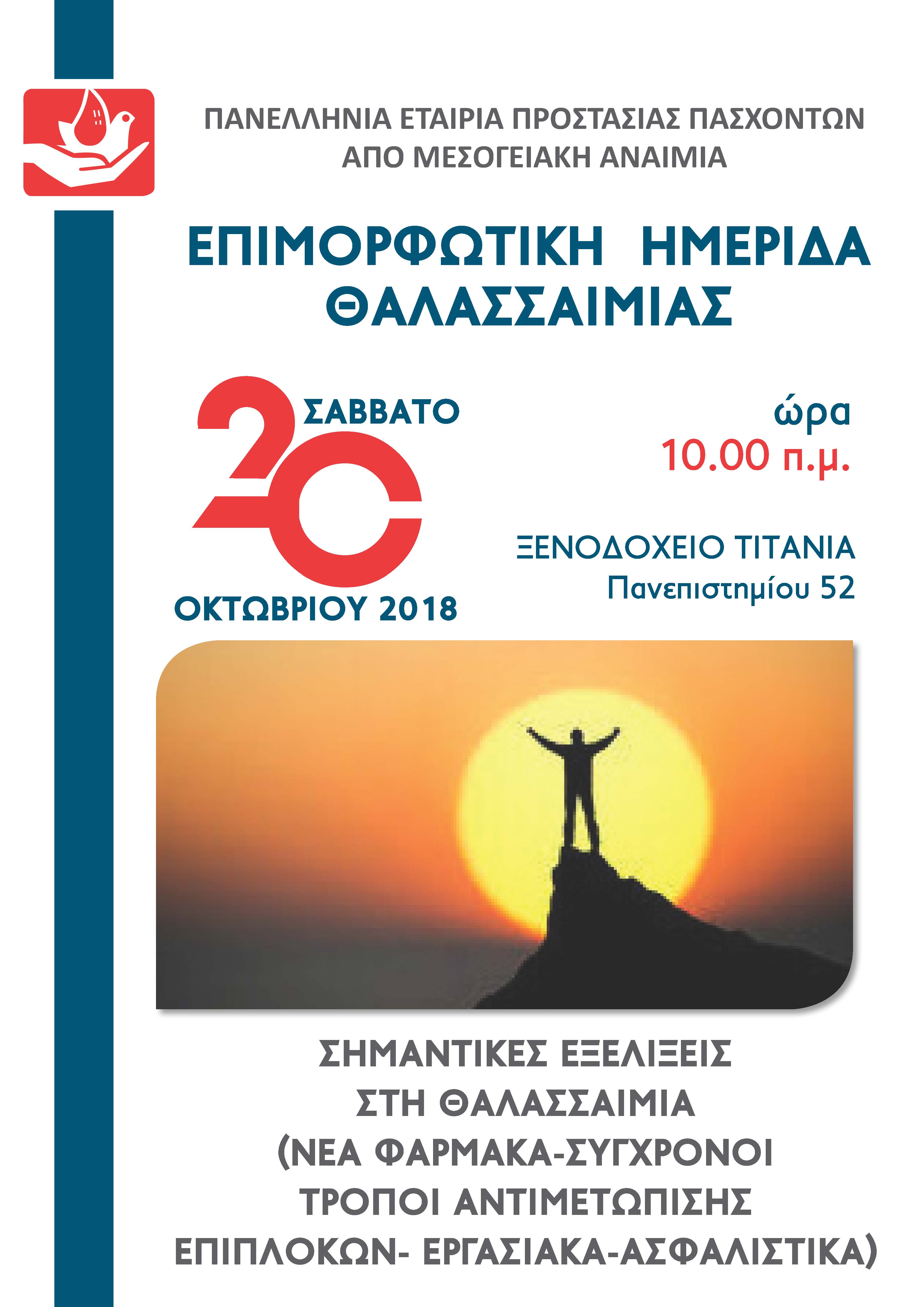 Ο Σύλλογος μας ΠΑΝΕΛΛΗΝΙΑ ΕΤΑΙΡΙΑ ΠΡΟΣΤΑΣΙΑΣ ΠΑΣΧΟΝΤΩΝ ΑΠΟ ΜΕΣΟΓΕΙΑΚΗ ΑΝΑΙΜΙΑ πραγματοποίησε το Σάββατο 20 Οκτωβρίου 2018 Επιμορφωτική Ημερίδα η οποία είχε πολύ μεγάλη επιτυχία καθώς η συμμετοχή του κόσμου της Θαλασσαιμίας ξεπέρασε κάθε προσδοκία μας. Η ανταπόκριση και η επιθυμία τους για ενημέρωση γύρω από τις νέες εξελίξεις στη θεραπεία, μας δίνει τη δύναμη να συνεχίσουμε τη δράση μας για να έχει ο κάθε πάσχοντας σε όλη την Ελλάδα ενημέρωση και σωστή παρακολούθηση από ιατρούς εξειδικευμένους στα θέματα της νόσου.