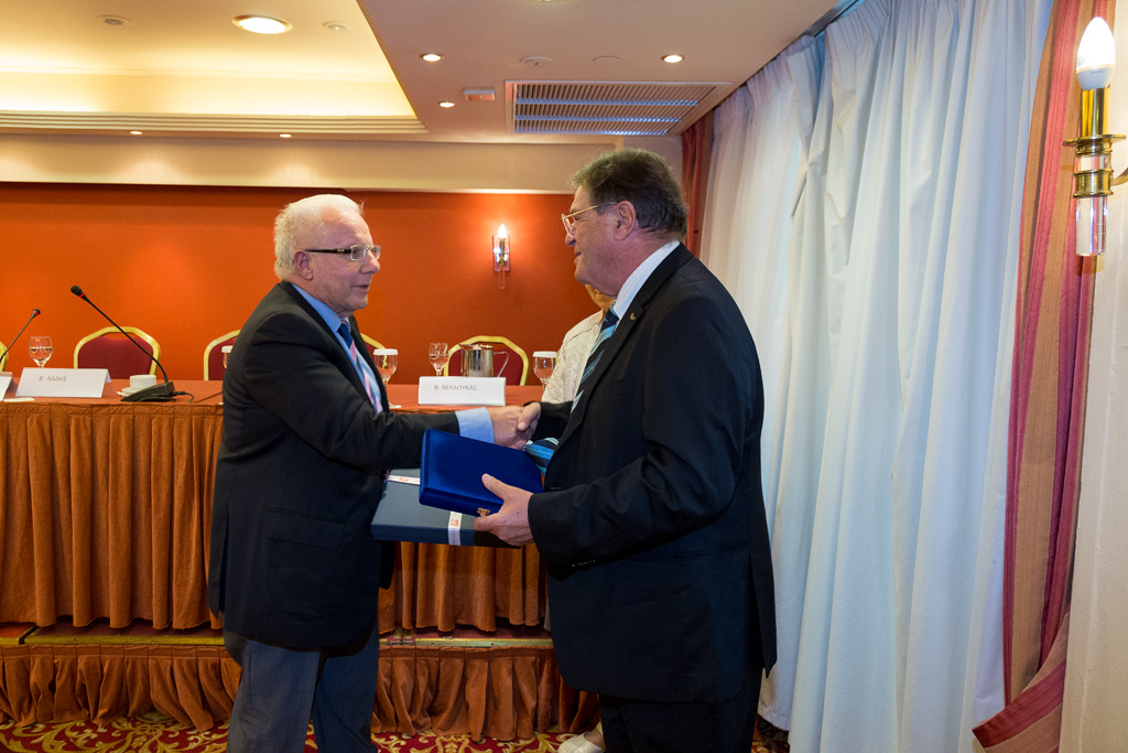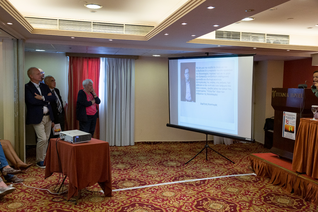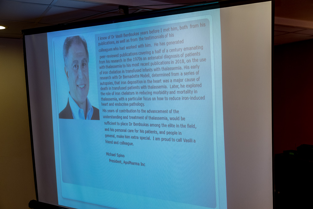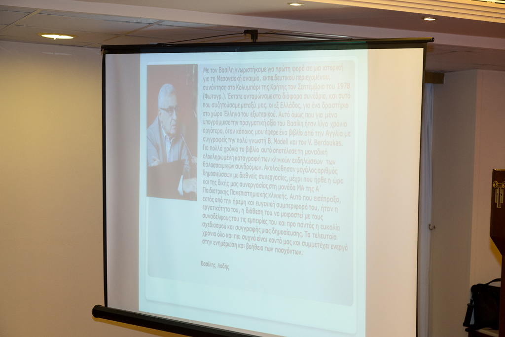 Στο σημείο αυτό ανέβηκε στο προεδρείο ο κ. Παπαγεωργίου όπου προλόγισε την τιμητική βράβευση στον Καθηγητή κ. Βερδούκα για την πολύχρονη προσφορά του στη Θαλασσαιμία.
